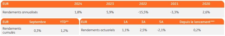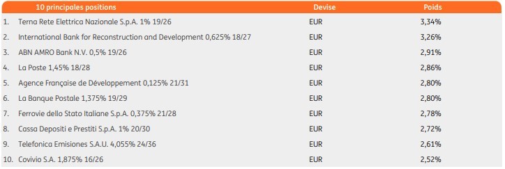 Le compartiment cherche à investir dans des émissions avec des stratégies d’investissement durable. L’investissement durable est une approche d’investissement qui tient compte de facteurs ESG dans la sélection et la gestion du portefeuille (Article 8 SFDR).